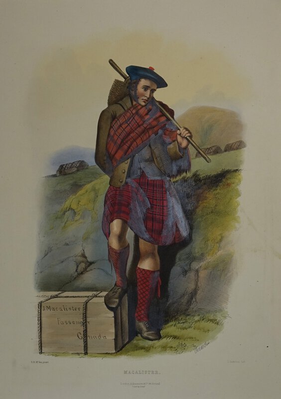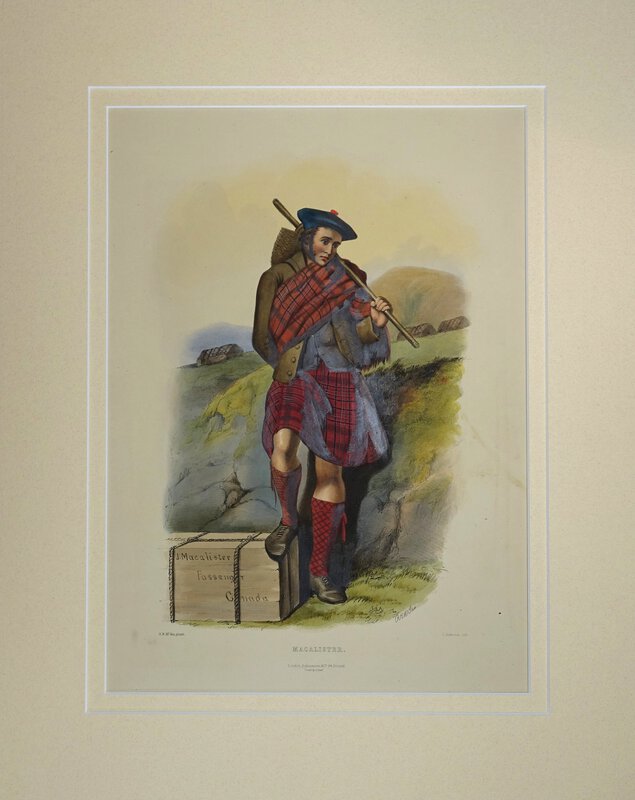1840. Large lithographic print, hand-coloured, drawn by R.R. McIan and engraved by L. Dickinson; double-mounted in acid-free mount with strong card backing, measures 44.4 x 56 cms (plate itself 29.2 x 40.5 cms) Published in 1845 on the centenary of the Jacobite Rising, The Clans of the Scottish Highlands includes text by James Logan, completed posthumously. Its striking images of Highland clansmen fuelled the romantic revival of interest in Gaeldom which was championed by Queen Victoria, to whom the book was dedicated. PLEASE NOTE: MAY REQUIRE EXTRA POSTAGE